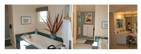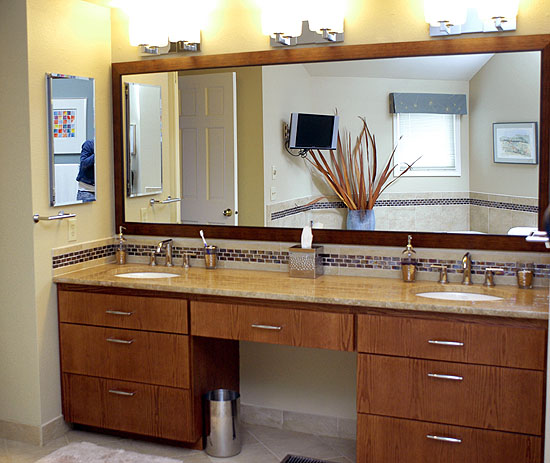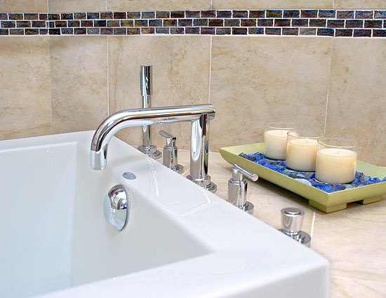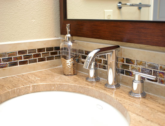 The luxurious master bath remodel features travertine slab countertop, glass mosaic tile, porcelain flooring and sleek modern chrome fixtures to create a retreat with a spa-like feel. Sparkle!