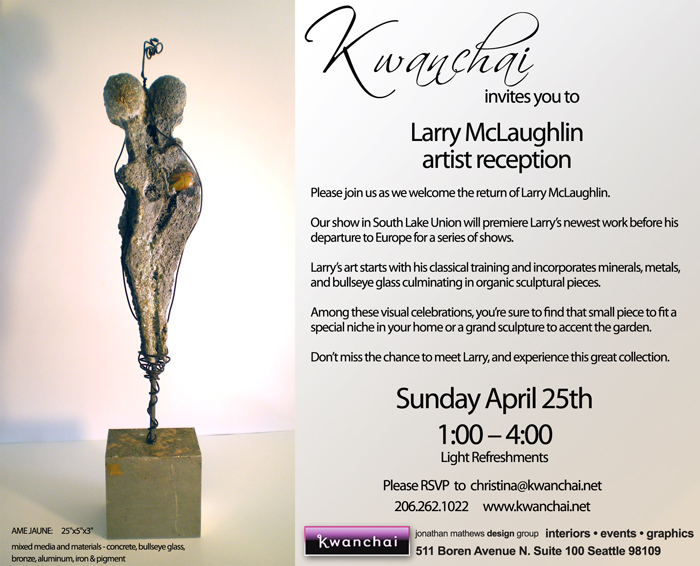 Larry returns to South Lake Union as the launch artist in Kwanchai's "artifacts" department, which will feature uniquely inspired objects offered to enrich your environment. These collections will lend themselves to personal spaces - home & garden, as well as being suitable to work space - office & corporate settings.