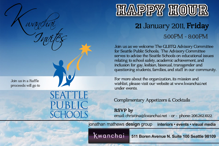 To Our Invited Guests & Friends: Kwanchai is pleased to host January's Happy Hour in support of the GLBTQ Advisory Committee for Seattle Public Schools. It brings us great joy and pleasure to meet new people in our community!